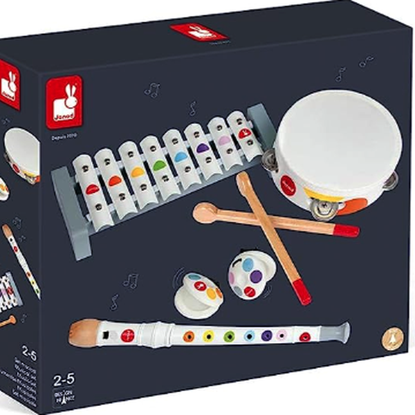 A coleção completa para o músico mirim perfeito! Este conjunto musical em madeira inclui 4 brinquedos instrumentos musicais para crianças a partir de 2 anos. Ele permite que as crianças experimentem vários instrumentos e encontrem o seu favorito ou criem sua própria banda de música com seus irmãos, irmãs e amigos. Seus filhos vão se divertir soprando na flauta, sacudindo o pandeiro com pratos, batendo no xilofone ou agitando as castanholas entre as mãos! Descobrindo os diferentes sons, despertando seus sentidos e se iniciando na improvisação musical, seus filhos pequenos não conseguirão mais viver sem esses belos brinquedos. Confetti é uma linha completa de brinquedos musicais cheios de cores e alegria, com padrões Pop N' Rock!